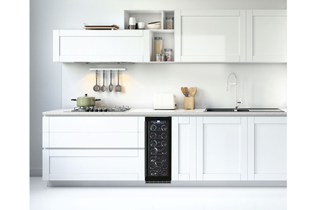 Wijnkast met ruimte voor maximaal 20 flessen. Deze kast heeft een bedrijfstemperatuurbereik van 5 °C tot 20 °C.